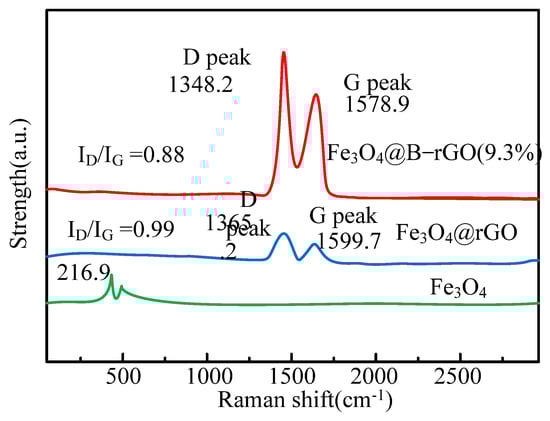 As shown in Figure 3, graphene is successfully combined with Fe3O4 in Fe3O4@rGO and Fe3O4@B-rGO (9.3%). However, in the spectra of Fe3O4@rGO and Fe3O4@B-rGO (9.3%), it can be seen that its characteristic peak has nothing to do with whether boron atoms are doped or not, which is because boron atoms and carbon atoms radii are similar. Raman spectroscopic analysis is used to prove the existence of graphene in the catalysts Fe3O4@rGO and Fe3O4@B-rGO (9.3%), and judge the defect state density of the catalysts. The analysis results are shown in Figure 4.