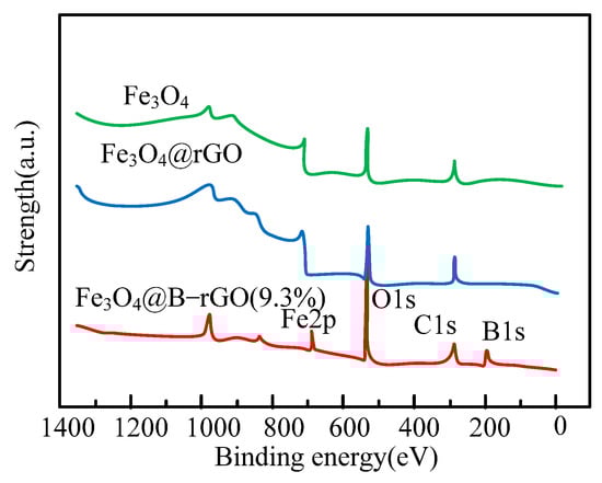 Full XPS spectra of Fe3O4@B-rGO (9.3%), Fe3O4@rGO and Fe3O4.