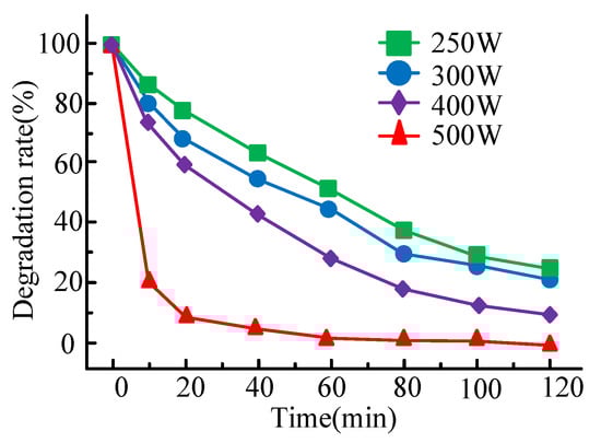 The influence of different illumination conditions on the heterogeneous Fenton system is studied. The research results on the treatment efficiency of bisphenol A are shown in Figure 6. The light intensity is 250 W, 300 W, 400 W, and 500 W, respectively.