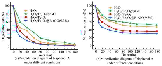 It can be seen from Figure 6 that when the light intensity is 250 W, 300 W, 400 W and 500 W, the corresponding bisphenol A treatment rates at 120 min are 76.4%, 77.9%, 88.4% and 100%, respectively, and the corresponding reaction rate constants are 0.012 min−1, 0.014 min−1, 0.018 min−1 and 0.051 min−1, respectively. It can be obtained that when the light intensity increases, the treatment rate of bisphenol A also shows an upward trend, and when the light intensity is 500 W, the treatment efficiency and reaction rate constant of the reaction system to bisphenol A both reach the highest values. To observe and compare the catalytic activity of different catalysts, hydrogen peroxide, hydrogen peroxide/Fe3O4@rGO, hydrogen peroxide/Fe3O4 and hydrogen peroxide/Fe3O4@B-, four different reaction systems of rGO (9.3%) are used to test its treatment effect on bisphenol A. Figure 6 shows the treatment and mineralization of BPA in the reaction system by each catalyst under different conditions.
