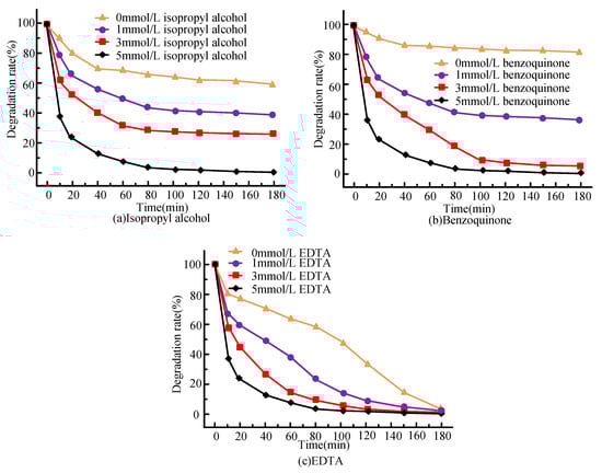 As shown in Figure 8a, it can be seenthat the treatment rate of bisphenol A in the reaction system decreases with the increase in C3H8O concentration, and the maximum inhibition rate of the reaction system can reach 52.7%, indicating that is the most important active radical of the system. Figure 8b shows that the treatment efficiency of bisphenol A is significantly inhibited by p-benzoquinone, and the maximum inhibition rate of bisphenol A reached 71.2%. It shows that is also the main active free radical in this system. It can be seen from Figure 8c that the addition of EDTA did not significantly degrade the bisphenol A in the system, and its maximum inhibition rate is 6.8%. It can be seenthat the effect is not obvious in this system.