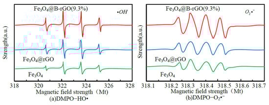 As shown in Figure 9, the spectrum contains DMPO-HO• characteristic peak with four times peak-to-peak ratio of 1:2:2:1 and DMPO-O2•-typical signal peak with four times peak-to-peak ratio of 1:1:1:1, but the signal peak of the Fe3O4@B-rGO(9.3%) system is obviously stronger than the other two systems, indicating that in the Fe3O4@B-rGO(9.3%) system, the generation capacity of active free radicals and is the highest among the three systems compared. Therefore, the heterogeneous Fenton photocatalytic performance of the reaction system using Fe3O4@B-rGO (9.3%) as catalyst is higher than that of the reaction system using Fe3O4 and Fe3O4@rGO as catalysts. The production of Fe2+ and the consumption of hydrogen peroxide in the photo-Fenton reaction of Fe3O4@B-rGO (9.3%), Fe3O4@rGO and Fe3O4 are investigated and analyzed, and the results are shown in Figure 10.