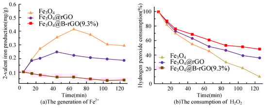 It can be seen from Figure 10a that the Fe2+ in the catalyst Fe3O4 continues to decrease with the photo-Fenton reaction. For the catalysts Fe3O4@rGO and Fe3O4@B-rGO (9.3%), the production of Fe2+ increases first and then decreases. The catalyst Fe3O4@B-rGO (9.3%) has a higher Fe2+ production than the other two catalysts, which further proves that the photo generated electrons generated by B-rGO promote Fe2+ and Fe3+ cycles. It can be obtained from Figure 10b that the consumption of hydrogen peroxide by the catalyst Fe3O4 is 52.1% within 120 min. While for Fe3O4@rGO and Fe3O4@B-rGO (9.3%) systems, the consumption of hydrogen peroxide in time reached 63.9% and 90.5%, respectively.