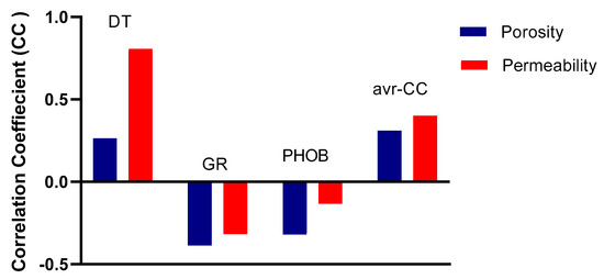 Further, an analysis process was performed to assess the dependency of the outputs (i.e., permeability and porosity) to the inputs of sonic time (DT), bulk density (RHOB), and gamma ray (GR) using a correlation coefficient (CC). Figure 3 shows that the permeability and porosity values were intensely dependent on the DT, GR, and RHOB with CC of 0.262, −0.385, and −0.319 for porosity and CC of 0.806, −0.316, and −0.133 for permeability, respectively. An average correlation coefficient (avr-CC) was calculated using the absolute values of CC for DT, GR, and RHOB. Figure 3 also shows that permeability had a higher avr-CC with the input parameter of 0.4.