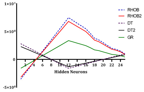 In Figure 4, the WV-curves show that the weights of RHOB and RHOB2 (RHOB × RHOB) and DT and DT2 (DT × DT) to the hidden neurons had almost the same behavior. This conclusion led to using one curve; RHOB and RHOB2 (similarly DT and DT2) can be omitted. Next, it was noted that there are five hidden neurons also contributed closely to the same amount to all the output neurons. Therefore, 5 neurons could be removed from the hidden layer, and a 3-25-1 configuration (i.e., RHOB, DT, and GR) was handled in the network architecture.