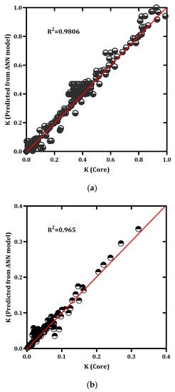 The predicted permeability from the ANN versus core permeability: (a) training; (b) testing.