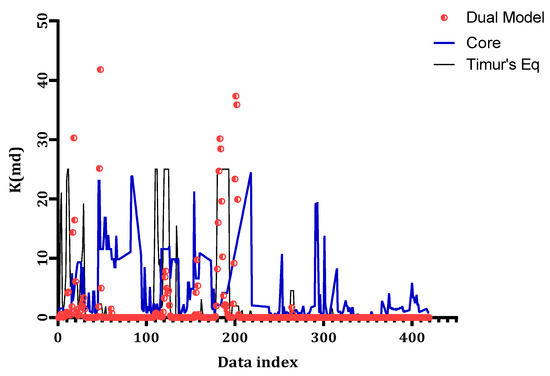 Figure 11 shows a comparison between the actual core permeability and that from the Timur’s and dual water models. This clarifies that the published correlations do not have the ability to predict core permeability for different formation lithologies and various hydraulic flow units.