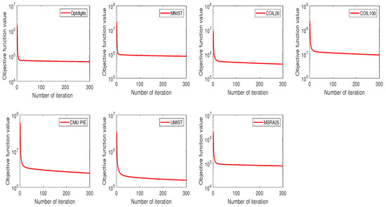 In order to validate that in (7) is monotonically nonincreasing under (12) and (16), we give the convergence curves of MSNMFSC on seven image datasets in Figure 1, in which the number of iteration and the value of are represented by the x-axis and the y-axis, respectively. According to Figure 1, we observe that the value of is monotonically nonincreasing under (12) and (16) for all the datasets used in our experiment, which shows Theorem 1 that have been proved in the convergence analysis section is correct.