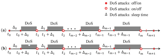 Situation of aperiodic DoS attacks. (a) presents the current instant in the sleeping interval, and (b) presents the current instant in the DoS attack interval.