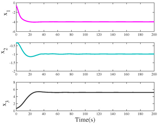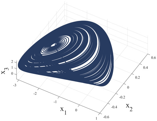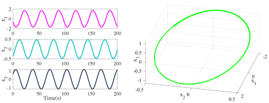 According to [33], there exists a chaotic attractor (see Figure 4) when some parameters are fixed at ; . Meanwhile, system (33) is rewritten as