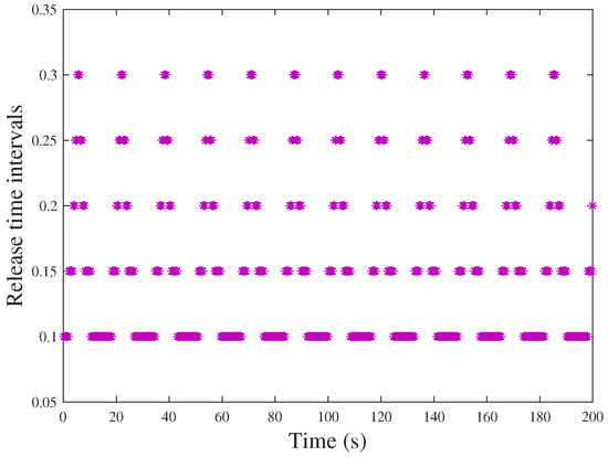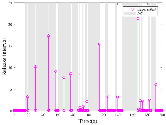 Case 2: In the sequence, under the same circumstances, once system (34) suffers from malicious aperiodic attacks, the system is unstable in Figure 9, where the gray areas represent the DoS attack time intervals. In addition, release time intervals are depicted in Figure 10 with 756 triggered packets to be successfully transmitted to the controller under the event-triggered communication scheme (7).