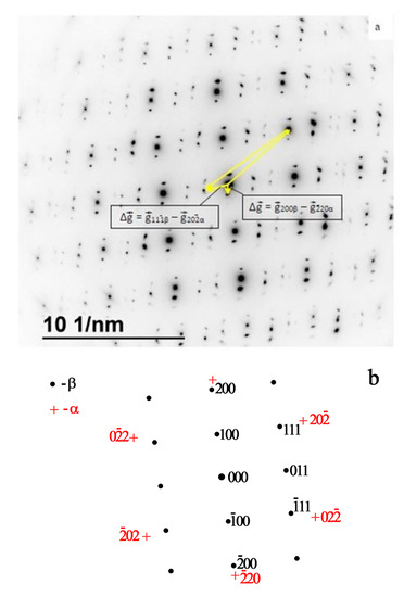 The β-phase predominates, and diffuse reflections of the α-phase with sharp point reflections of the β-phase provides the conclusion that the single crystal β-phase is formed within a studied area of the initial phase with the mosaic substructure. This conclusion is also confirmed by HRTEM image (Figure 3).