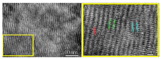 (a) HRTEM image of a part of the Cu-Pd36 sample within the block of α-phase subgrains, (b) enlarged fragment containing interference bands with a period equal to the β-phase crystal lattice parameter , and moiré patterns with the periods and (2 and 3).