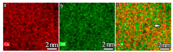 Distribution of components (EDXS elementl maps) in the Cu-Pd36 sample: (a) Cu, (b) Pd, (c) Cu + Pd. One of Cu cluster is indicated by an arrow.