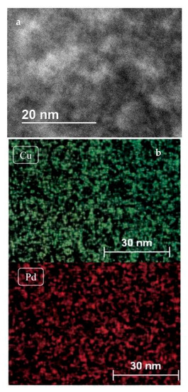 Figure 6a,b demonstrate Cu and Pt distribution of α-phase components, respectively obtained by EDXS mapping. It follows that this structure contains approximately an order of magnitude larger clusters than the ordered structure of the Cu-Pd36 sample.