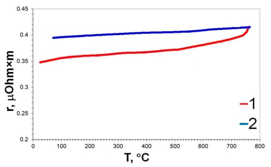 Figure 7 characterizes the variation of the electrical resistivity in the heating (1)–cooling (2) cycle.