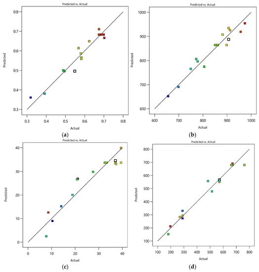 Predicted vs. actual responses in SWE: (a) yield, (b) TAC, (c) TPC, and (d) TFC. (Different colour of figure means to number of experiments).