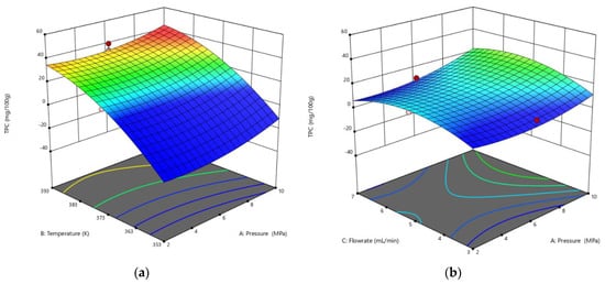The 3D response of the effects of variables on the total phenolic compounds (TPC) (mg/100 g) at (a) a constant flow rate of 5 mL/min and (b) a temperature of 393 K.
