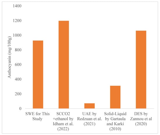 The data suggest that SWE yields more anthocyanin than UAE and solid–liquid extraction but less than the ScCO2 and DES methods, as shown in Figure 7. This is due to the supercritical carbon dioxide used as a higher-pressure solvent, which increases the density and diffusivity of the solvent in order to extract anthocyanin. However, additional production and safety expenses arise from heightened pressure circumstances. Additionally, DES is unsuitable for anthocyanin since methanol is considered a hazardous solvent. Due to water being a nontoxic and safe solvent for the anthocyanin recovery, this technique (SWE) may thus be employed in replacement of the conventional method for extracting anthocyanin.