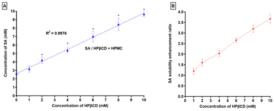 (A) Phase solubility profile of SA in presence of HPβCD and HPMC (5%) and (B) SA solubility enhancement ratio in presence of HPβCD and HPMC (5%), * p < 0.05 as compared to S0.