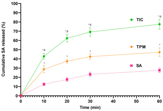 Dissolution profile of SA, TPM, and TIC, * p < 0.05 as compared to SA, $ p < 0.05 as compared to TPM.