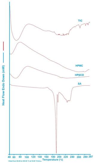 DSC thermograph of SA, HPβCD, HPMC, and TIC.