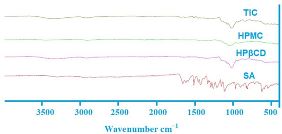 FTIR spectra of SA, HPβCD, HPMC and TIC.