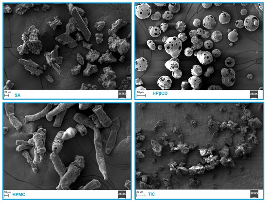 As shown in Figure 6, TIC, HPβCD, and HPMC were characterized using SEM. The surface of SA gives the impression of being fairly smooth and compact. HPMC appears to be elongated, thin, crumpled, and slightly distorted. The HPβCD sample has a rough surface and a thick appearance.