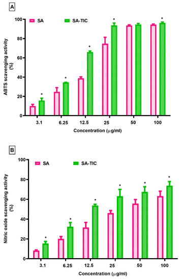 (A) ABTS and (B) nitric oxide scavenging activity of SA and TIC, * p < 0.05, as compared to SA.