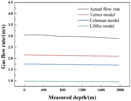 - Using the method for determining the coefficient of the proposed liquid-carrying model, a model suitable for each horizontal gas well was determined. Furthermore, the critical liquid-carrying flow rates of the vertical and inclined parts of the horizontal well were calculated. If the gas flow rate in the wellbore was higher than the calculated critical liquid-carrying flow rate [36], fluid accumulation did not occur in the gas well; by contrast, fluid accumulation occurred in the gas well if the flow rate was lower than the calculated value. By contrast, fluid accumulation occurred in the gas well if the flow rate was lower than the calculated value.