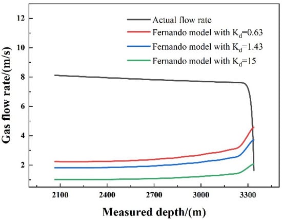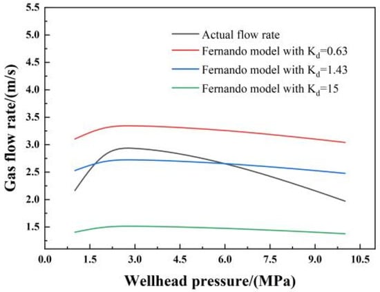 - The kickoff point [33] was selected to match the critical liquid-carrying capacity of both the vertical and inclined sections. The wellhead was varied to calculate the flow rates using the Turner, Coleman, and Li Min models under the original formation pressure. Furthermore, the Fernando model was fitted to the flow rates. The different values of Kd were obtained according to the fitting.