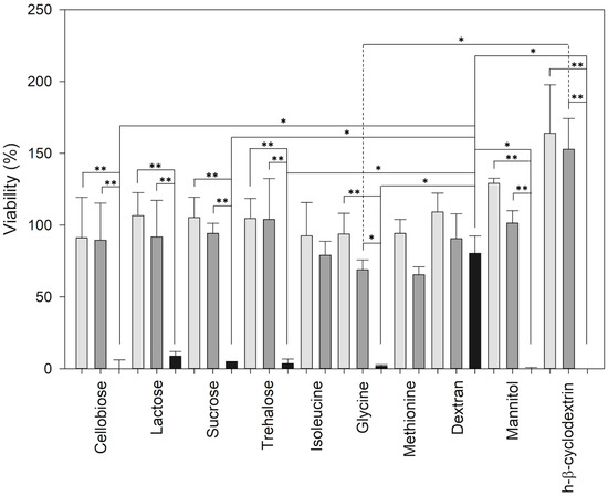 Comparing the different excipients at the same concentrations, the viability of cells treated with dextran at 100 mg/mL was considerably higher than the ones treated with hp-β-cyclodextrin (p = 0.006), cellobiose (p = 0.018), mannitol (p = 0.024), glycine (p = 0.031), trehalose (p = 0.037), and sucrose (p = 0.041). Differently, at 10 mg/mL, cells were less affected by the treatment with hp-β-cyclodextrin if compared with glycine (p = 0.017).