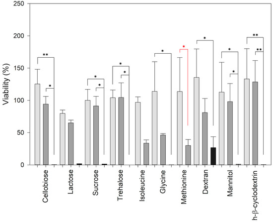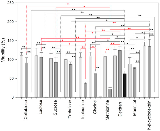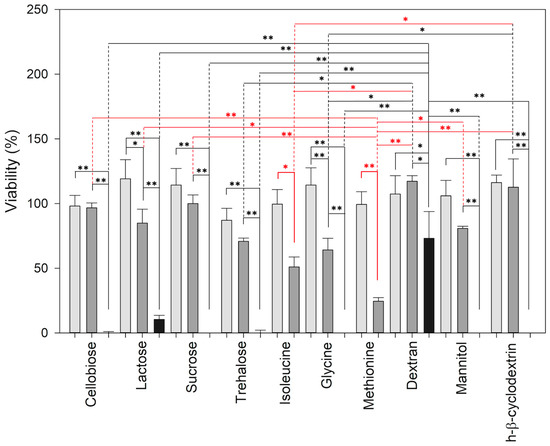 The graph represents the viability of lymphocytes after 48 h of treatment with the different excipients. Light grey is 1 mg/mL, dark grey is 10 mg/mL, and black is 100 mg/mL. Data are displayed as mean ± SE. ** for p ≤ 0.001 and * for p ≤ 0.05. Black asterisks represent the comparison of excipients at the three concentrations, without isoleucine and methionine, red asterisks, for all excipients at 10 and 1 mg/mL.