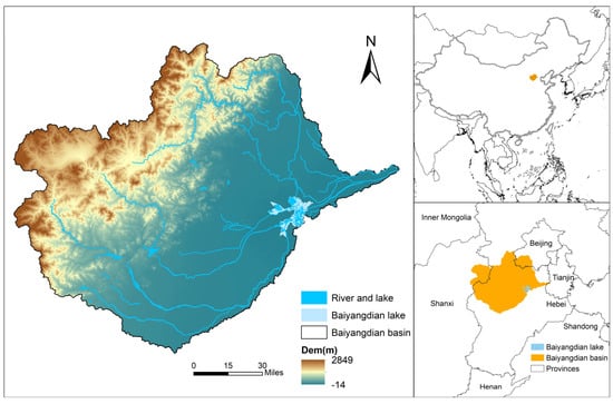 Baiyangdian Lake, located in the North China Plain, is a lake in the southern branch of the Daqing River system and is one of the most important ecological water bodies in the Xiong’an New Area. With a total area of 366 km2 and an average water storage of 1.32 billion cubic meters, Baiyangdian Lake is the largest lake in Hebei Province and is known as the kidney of North China and the pearl of North China [31]. The Baiyangdian basin spans four provinces, namely Beijing, Tianjin, Hebei and Shanxi, and is located between 113°20′–116°54′ E and 38°05′–40°04′ N. The basin covers an area of approximately 33,096.57 km2 (Figure 1). Its topography slopes from northwest to southeast, forming three major landform units: mountains (hills), plains and wetlands. In terms of climate, the Baiyangdian basin belongs to a temperate continental monsoon climate zone, with four distinct seasons and simultaneous rain and heat. Precipitation in the basin is unevenly distributed spatiotemporally, with an annual average of about 640 mm. A total of 80% of the precipitation is concentrated in July, August and September with large inter-annual variations. Spatially, precipitation decreases from the mountains to the plains. The average annual temperature of the basin ranges from 7.3 to 12.7 °C and decreases from the plains in the southeast to the mountains in the northwest [32].