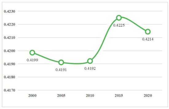 The results of the Baiyangdian basin EQI measurement between 2000 and 2020 are shown in Figure 3. Since the 21st century, China has made great achievements in terms of urbanization and industrialization. However, this has inevitably led to the encroachment of cropland and ecological land by construction land. The increasingly serious contradiction between man and land has also led to a series of serious ecologically damaging land use activities such as deforestation and the reclamation of lakes into cropland. It is in this context that the EQI of the Baiyangdian basin fell from 0.4199 to 0.4191 between 2000 and 2005. From 2005 to 2010, the EQI of the Baiyangdian basin increased from 0.4191 to 0.4192. The improvement in the quality of the eco-environment was related to the policies that have been implemented by the local government in the Baiyangdian basin, including the Key Shelterbelt Construction Program (KSCP), the Natural Forest Conservation Program (NFCP), the Afforestation Program for Taihang Mountain (APTM) and the Grain to Green Program (GTGP) [42,43]. During this period, the area of sparse forestland and high-cover grassland in the Baiyangdian basin increased by 14.05 km2 and 115.33 km2, respectively, which led to an increase in the EQI to some extent. Since 2010, China has gradually stepped into a new normal of economic development. As a result of increased pressure on resources and the environment, as well as increased consumer awareness of environmental protection, China has also become more aware of the importance of environmental protection. All provinces, autonomous regions and municipalities directly under the central government, and this includes the Baiyangdian basin governments at all levels, have actively introduced measures related to ecological restoration. As a result, between 2010 and 2015, the EQI of the Baiyangdian basin improved to a greater extent, with its value increasing from 0.4192 to 0.4225. However, the previously emerged conflict between humans and land has shown an explosive trend in recent years, manifested by a decline in the EQI, whose value dropped from 0.4225 in 2015 to 0.4214 in 2020. This was mainly due to a certain conflict between the restrictions on the red line of cropland in the Baiyangdian basin and urbanization. In conclusion, the EQI of the Baiyangdian basin generally showed a fluctuating upward trend from 2000 to 2020. However, the decline in the EQI in recent years indicates that the contradiction between humans and land in the Baiyangdian basin is becoming more pronounced. How to manage the balance between cropland, construction land and ecological land in the future is an urgent issue for local governments in the Baiyangdian basin.