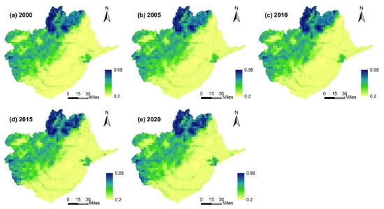 The spatial and temporal pattern of the EQI in the Baiyangdian basin is shown in Figure 4. The results of the study showed that the spatial and temporal patterns of eco-environmental quality in the Baiyangdian basin remained generally stable during the study period. The EQI showed a trend of being higher in the northwest and lower in the southeast, indicating that the eco-environmental quality of the Taihang Mountains in the western part of the study area was generally better than that of the North China Plain in the eastern part of the study area. The North China Plain, where the eastern part of the Baiyangdian basin is located, is a population and economic agglomeration in northern China. Socio-economic development and population agglomeration were the main reasons for the poorer eco-environmental quality in the eastern part of the basin. Baiyangdian Lake is a hotspot of eco-environmental quality in the North China Plain, and it plays an integral role in the ecological regulation function of the core area of the Beijing–Tianjin–Hebei urban agglomeration as well as the Baiyangdian basin. From 2000 to 2020, the EQI of Baiyangdian Lake showed a fluctuating upward trend, indicating an improvement in the quality of the eco-environment near Baiyangdian Lake. The Taihang Mountains, where the northwestern part of the basin is located, is an area with high values of the EQI. The main characteristics of the Taihang Mountains in the western part of the basin are higher altitude, complex natural conditions, lower average temperatures and more luxuriant vegetation cover, hence its higher EQI. Moreover, the EQI of the Taihang Mountains in the western part of the basin continued to rise gradually over the study period.