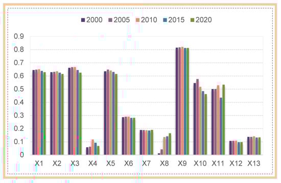 The spatial and temporal pattern of the eco-environmental effect of LUCC in the Baiyangdian basin is formed by the combined effect of many factors. By referring to previous studies and repeated experiments, this paper selected thirteen factors from five aspects: topography, climate, soil and vegetation, human activities and location, to explore the mechanism of the formation of the spatial pattern of the eco-environment in the Baiyangdian basin. Topography is a decisive factor in the formation of the spatial and temporal distribution of the eco-environment. Since the Earth was formed, the structure of its crust and surface form has been changing. Changes in land and sea, mountains and rivers, as well as the birth and death of life, are all the result of changes in the Earth’s surface morphology. This paper, therefore, selected topographic relief (X1), slope (X2) and altitude (X3) to detect the influence of topography on the spatial and temporal evolution of the quality of the eco-environment [35,36]. Over historical periods, topography has determined the evolutionary processes and trends in eco-environmental quality. Climate, soil and vegetation, human activities and location are the main drivers of the spatial and temporal evolution of eco-environmental quality over short periods. Climate is the most direct and sensitive factor in the evolution of regional eco-environmental quality, which can influence the evolution of regional eco-environmental quality at any spatial or temporal scale as well as play an important role in the evolution of regional eco-environmental quality. This paper therefore selected precipitation (X4) and temperature (X5) to detect the influence of climate on the spatial and temporal evolution of the eco-environmental quality [26]. Soil and vegetation are the most prominent sign of the surface system of the Earth and have a significant impact on eco-environmental quality. Therefore, in this study, soil type (X6), organic carbon content of soil (X7) and NDVI (X8) were chosen to characterize the influence of soil and vegetation on the spatial and temporal evolution of eco-environmental quality [37]. Human activity is the most dynamic factor influencing the evolution of eco-environmental quality. In this study, land use intensity (X9), population density (X10) and nighttime lighting (X11) were chosen to detect the influence of human activities on eco-environmental quality [21]. Among these indicators, with reference to the research of Cai et al. [38], this study introduced nighttime lighting to indicate the socio-economic level of the Baiyangdian basin. In addition, the distance from roads (X12) and the distance from railways (X13) were also included in the model to explore the influence of accessibility on the spatial heterogeneity of the eco-environment in the Baiyangdian basin [21].