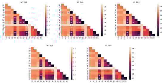 Results of interaction factor detection for the EQI in the Baiyangdian basin. Note: + means that the two detection factors were non-linear enhancement, and no + means that the two detection factors were two-factor enhancement.