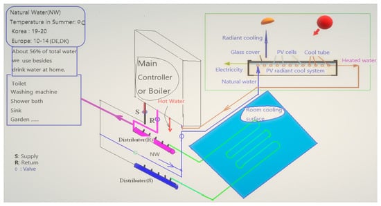 Conventional radiant heating systems, which are used for space heating only in cooler temperatures, can also be used to cool a room without causing any loss or waste of city water or power input by releasing city water again through an embedded pipeline already installed in conventional radiant heating systems while the occupants are using the water at home. This is a form of the passive intelligent radiant cooling concept that is controlled and cooled by just the water pressure and enthalpy of the city water, like tap water. If we open the water tap, water is automatically released by the pressure of the city water. In Korea, even when the outside air temperature is over 36 °C during the cooling period, natural city water has a temperature of approximately 19–20 °C in principle because the city water is supplied at least 90 cm under the earth, according to Korean law. The corresponding city water temperatures are, respectively, 19–20 °C in Turkey and 10–14 °C in Germany and Denmark []. Natural city water flows through a pipeline that is embedded in the cooling surface during the occupants’ water use for toilets, washing machines, cleaning, car washing, garden watering, and showering, which corresponds to approximately 56% of the water we use at home []. It is similar to one of the multi-purpose principles in which the room is automatically heated by the hot exhaust that flows into the heating flue after burning timbers to cook something in a kitchen in a traditional On-dol (warm stone plate) radiant heating system in Korea [,]. No power or water is required to cool the room. The enthalpy of natural city water for radiant cooling is used to cool the room space, and the used water continues to flow through the system for necessary tasks such as using toilets, running washing machines, washing cars, cleaning, and watering gardens.