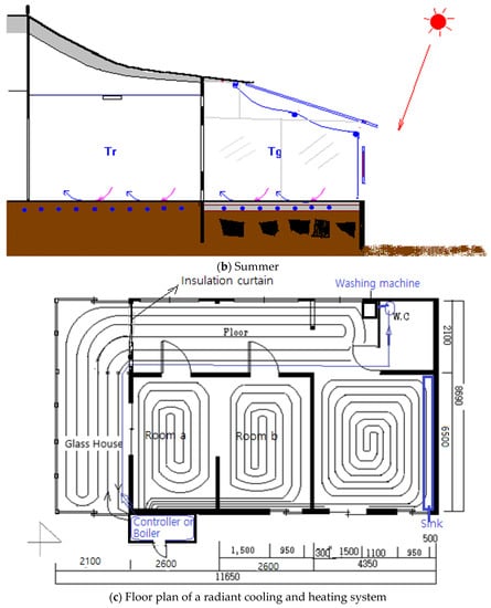 The thermal behavior and capacity of the passive intelligent radiant cooling system are evaluated in a house located in Chung-Nam Province, Republic of Korea. Figure 2 shows the section of the attached glass house (Figure 2a,b) and the floor plan of a radiant cooling and heating system (Figure 2c).