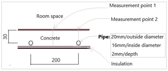The balance of heat within the human body is about 46–50% influenced by radiation exchange in the built environment [,]. Therefore, thermal characteristics in a radiant built environment need to be precisely accessed through an efficient evaluation method []. The heat flow density on a floor surface was determined by pipe spacing, thickness, and heat conductivity of the layer above the pipe, etc. []. Radiant cooling can be an energy-efficient strategy, thereby reducing both sensible and latent loads in spaces [].