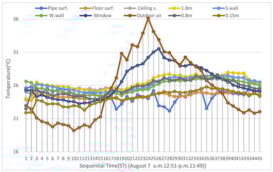 Measurements were made every 30 min starting from 12:45 am (a.m. 12:51–p.m. 11:49) for 24 h. The highest outdoor air temperature is 36.1 °C at 12:51 (ST (Sequential time): 24). The gardening water was supplied from a.m. 09:30–09:45. The sequential time corresponds to 17–18 (a.m. 09:12–09:44) in Figure 4. A person took a shower from a.m. 11:00–11:12 (21 (ST): 11:17:36). The washing machine was used from p.m. 13:35–15:25 (25 (ST): p.m. 1:22:51, about 75 L water consumption per one load of laundry). The gardening and car washing were done from 18:05–18:33 (34 (ST): p.m. 6:04:38). A person took a shower from 21:00–21:10 (40 (ST): p.m. 9:12:31). A person usually used the WC 8–9 times per day. If water is used during the shower, the laundry, and the WC usage, etc., the embedded pipe surface temperature automatically goes down so that the concrete structure that contacts the cooling pipe falls in temperature to cool the corresponding room. This causes a fall in the surrounding surface temperature, including the ceilings, walls, and window surfaces, increasing the thermal comfort for the occupant due to cold radiant effects. During laundry cycles, the floor surface temperature is 24.69 °C while the temperature at 0.15 m height is 24.64 °C. The ceiling surface temperature is 26.4 °C while the air temperature is 27.1 °C at the near position of the ceiling surface. The west wall surface, south wall surface, south window surface t, and air temperatures at a height of 0.8 m are, respectively, 26.22 °C, 26.67 °C, 31.51 °C, and 26.71 °C. The temperature difference profile between the surface temperature and air temperature at the same height shows a similar distribution to the temperature profile between the floor surface and 0.15 m height air temperature due to the cold radiation effect. However, the temperature difference profiles near the vertical surfaces and ceiling surface show, respectively, 0.7 °C (ceiling: 27.1–26.4), 0.5 °C (west wall: 26.71–26.22), 0.04 °C (south wall: 26.71–26.67), and −4.8 °C (window: 26.71–31.51). The similar temperatures at the south wall and window come from the poor insulation of the south wall and the window and the high air temperature of the glass house.