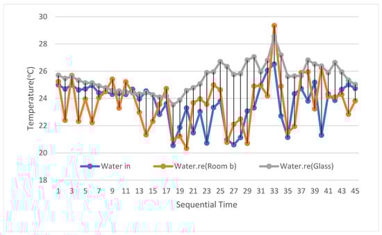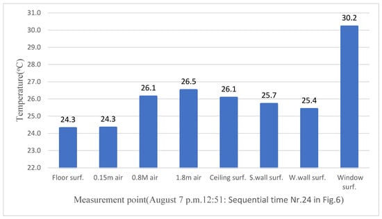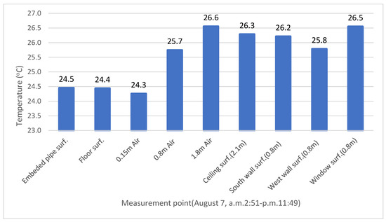 Measurements were made every 30 min starting from 12:45 am (a.m. 12:51–p.m. 11:49) for 24 h. The highest outdoor air temperature is 36.1 °C at 12:51 (ST (Sequential time): 24]. The gardening water was supplied from a.m.09:30–09:45. The sequential time corresponds to 17–18 (a.m. 09:12–09:44) in Figure 4. A person took a shower from a.m. 11:00–11:12 (21 (ST): 11:17:36). The washing machine was used from p.m. 13:35–15:25 (25 (ST): p.m. 1:22:51, about 75 L water consumption per one load of laundry). The gardening and car washing were done from 18:05–18:33 (34 (ST): p.m. 6:04:38). A person took a shower from 21:00–21:10 (40 (ST): p.m. 9:12:31). A person usually used the WC 8–9 times per day. If water is used during the shower, the laundry, and the WC usage, etc., the embedded pipe surface temperature automatically goes down so that the concrete structure that contacts the cooling pipe falls in temperature to cool the corresponding room. This causes a fall in the surrounding surface temperature, including the ceilings, walls, and window surfaces, increasing the thermal comfort for the occupant due to cold radiant effects. During laundry cycles, the floor surface temperature is 24.69 °C while the temperature at 0.15 m height is 24.64 °C. The ceiling surface temperature is 26.4 °C while the air temperature is 27.1 °C at the near position of the ceiling surface. The west wall surface, south wall surface, south window surface t, and air temperatures at a height of 0.8 m are, respectively, 26.22 °C, 26.67 °C, 31.51 °C, and 26.71 °C. The temperature difference profile between the surface temperature and air temperature at the same height shows a similar distribution to the temperature profile between the floor surface and 0.15 m height air temperature due to the cold radiation effect. However, the temperature difference profiles near the vertical surfaces and ceiling surface show, respectively, 0.7 °C (ceiling: 27.1–26.4), 0.5 °C (west wall: 26.71–26.22), 0.04 °C (south wall: 26.71–26.67), and −4.8 °C (window: 26.71–31.51). The similar temperatures at the south wall and window come from the poor insulation of the south wall and the window and the high air temperature of the glass house.