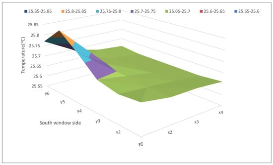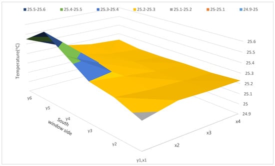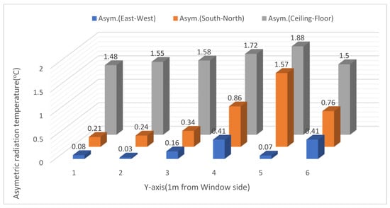 The maximum asymmetric radiation (1.88 °C) is raised at y5 (the ceiling and floor on the window side). Asymmetric radiation does not happen in this radiant cooling space because the floor’s radiant cooling surface radiates to the surrounding surfaces mostly by the radiation. The highest radiant asymmetry is 1.88 °C near the south window side. Local thermal discomfort is not caused by the passive intelligent radiant cooling system in any position in the room because the limitation for asymmetric radiation to radiant cooling ceiling is 14 °C []–15 °C []. However, there are currently no recommendations or standards for asymmetric radiation of radiant floor cooling systems anywhere in the world.
