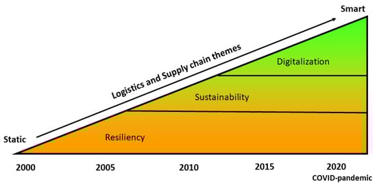 Resiliency, sustainability, and digitalization are key concepts towards viable supply chains and logistics []. These key concepts have emerged through time and have been individually studied by scholars. The COVID-19 pandemic period demonstrated that the (potential) added value of these key concepts should be considered in conjunction. Figure 1 shows the evolution of these concepts and the ways in which it leads to the development of smart logistics and supply chains. Ivanov [] argued that logistics and supply chain viability can only be achieved by approaching the resiliency, sustainability, and digitalization at an holistic perspective and not individually. This paper uses the concepts of resiliency, sustainability, and digitalization found in Figure 1 to analyze the trends and innovations in logistics before and after the onset of COVID-19 pandemic. The remainder of this section elaborates these concepts.