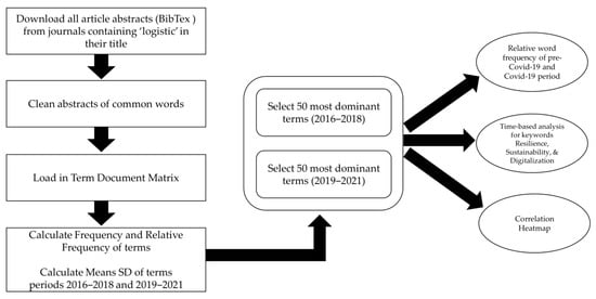 The Science Direct advanced search function was used to find articles published in journals that contain “logistics” in their title and that were published in the years 2016–2021. Citation information of these articles was downloaded in BibTex format. The BibTex citation data was parsed using the Python 3.7 and pybtex version 0.24.0. The R tm package was used to load the article abstract and metadata and to perform text mining. Article citation data including article abstracts were retrieved and filtered on articles containing at least a title, abstract and doi. This amounted to 5098 logistics papers published in the period of 2016–2021. The 5098 papers represent all available literature in logistics and were used in the analysis to prevent bias. To support our aim of understanding the impact of the COVID-19 pandemic on trends and innovations in the logistics sector (regarding resiliency, sustainability, and digitalization), we divided articles into two periods: (1) 2016–2018, which represents the pre-COVID-19 period, and (2) 2019–2021, representing the COVID-19 period up to the date of writing.