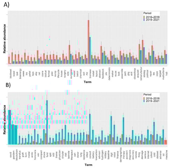 Figure 3 presents the 100 words with the largest difference in relative abundance between before and during COVID-19 pandemic time frame. The red color in the figure indicates the before-COVID-19 years (2016–2018) while the blue color represents the during-COVID-19 years (2019–2021). The relative word frequency shows a clear difference between words trending before and after the start of the COVID-19 pandemic. In Figure 3A, word frequency indicates a strong focus before COVID-19 on (1) sustainability via “bioenergy”, “biomass”, “bio-fuel”, “wood”, “lifecycle”, “e-waste”, “closed-loop”, “remanufacturing” and “reuse”; (2) single market and logistics of “soil”, “feedstock”, “chemical”, and (3) Logistics Service Provider (LSP) such as “rail” and “crane”. There is also a strong focus on “medicines” due to the global shortage of medicine in years 2016–2017; see, for example, [,].