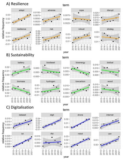 Figure 4 shows the trends in the terms of resiliency (Figure 4A), sustainability (Figure 4B), and digitalization (4C). The lines represent the linear trend lines with the gray areas representing the 95% confidence interval. A complete overview of the time-based analysis of all the 100 terms can be found in the Supplementary File S1.