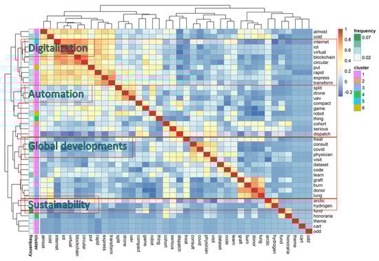 To obtain in-depth insights about the words that are dominantly occurring during the COVID-19 period, we perform a correlation analysis. We selected the 80 words with the highest relative frequency (most abundant) during the COVID-19 period as seed for a new Term Document Matrix to identify associated words. We plotted a heatmap of the Euclidian distance between terms, showing clusters of correlated words which have a lower Euclidian distance.