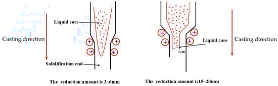 There are two meanings of SR from the perspective of reduction amount: one is to apply a minimum reduction amount of less than 6 mm at the solidification end, while the other one is to apply a large reduction amount of 15–20 mm at the liquid metal core [57]. The reduction amount will be applied at the core of liquid metal before the solidification end, which is also called liquid core SR. The position and amount of SR can be different from the liquid core soft reduction, but the principle of reduction will be the same. Therefore, SR can be understood as a special form of liquid core reduction. The difference between the two types of SR is shown in Figure 2.